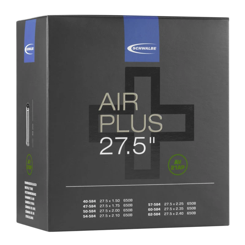 Schwalbe AIR PLUS Fahrradschlauch Nr. 21AP. FĂĽr Fahrradreifen in der Größe 27.5″ Zoll (ETRTO 40/62-584). Hält die Luft dank höherer Wandstärke noch länger. Nachpumpen ist weniger oft notwendig. SchĂĽtzt zudem ĂĽberdurchschnittlich gut gegen Pannen.